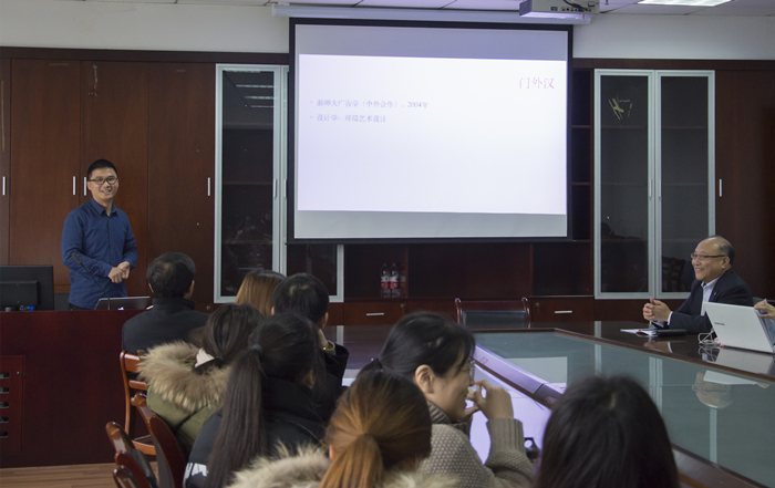 2018年12月20日13:20,广告系邀请到浙江师范大学文化与创意学院教师、创意设计工作室负责人王陈辉老师就大广赛相关问题进行指导讲座。潘文年副院长、广告系厉国刚老师、沈铁鸣老师、陈国泉老师、门书均老师,新闻系李蓉老师、编辑系殷克涛老师以及16、17级广告系学生参加此次讲座。广告系主任徐少丹主持此次讲座。