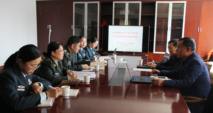 2019年11月20日,国防科技大学文理学院人文科学系政治协理员张志斌,语言与逻辑学教研室主任陈金琳、副主任雷奕,讲师张小玲和钟雅琼来色情片 调研。色情片 副院长潘文年、中文系主任郭剑敏与他们就《大学语文》课程建设、人文通识教育等方面的情况进行了探讨,并就色情片 中文学科发展现状、《大学语文》建设情况、写作与沟通课的探索实践、网络课程资源的开发利用以及学生文学社团活动的组织开展等方面进行了深入的交流。