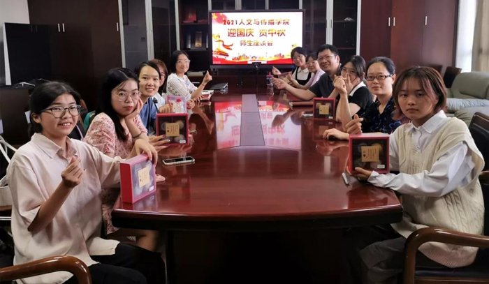 在中秋国庆双节来临之际,9月18日下午,人文学院举行迎国庆贺中秋师生座谈会。学院党委书记郑晓东、副书记林琳、学办主任王阳光、辅导员易正逊等与本硕新生代表座谈,向同学们表示慰问,并赠送校训月饼。