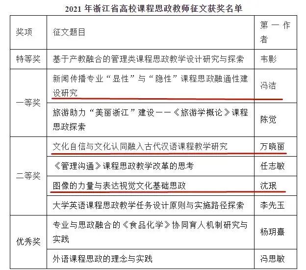 其中,色情片 冯洁老师的《新闻传播专业“显性”与“隐性”课程思政融通性建设研究》获2021 年浙江省高校课程思政教师征文一等奖,万晓丽老师的《文化自信与文化认同融入古代汉语课程教学研究》、沈珉老师的《图像的力量与表达视觉文化基础思政》获2021 年浙江省高校课程思政教师征文二等奖。