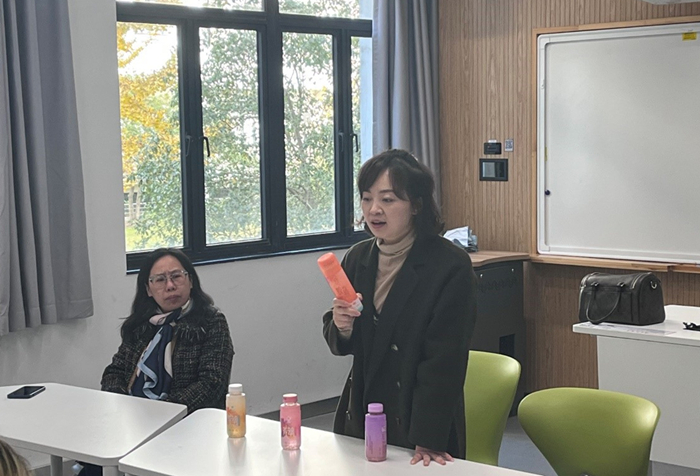 苏总分享了自己创办汝乐品牌的心路历程和推出新产品的初步想法,并邀请大家共同对产品逻辑进行审视和验证。同学们结合自己的偏好,指出目前汝乐品牌的产品在瓶身风格设计上还需要做出改进。沈铁鸣老师也举了元气森林无糖乌龙茶瓶身“燃”字和喜茶清暴柠、浓暴柠“茶多酚含量≥600mg/kg”的字样设计案例,从心理与产品包装效果两个角度对产品的设计提出建议。