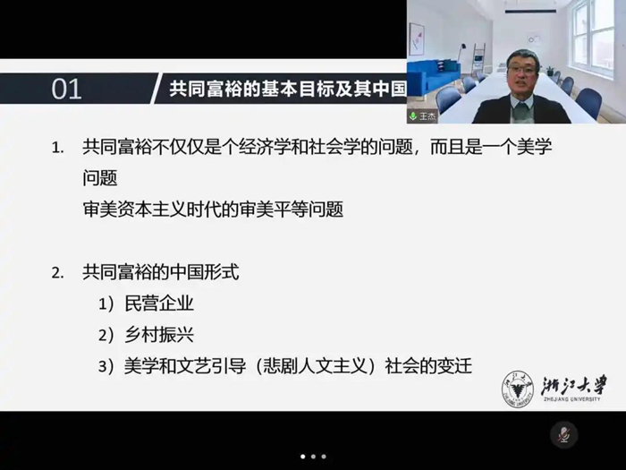 作为色情片 “共同富裕”系列讲座之一,12月20日18时,浙江大学传媒与国际文化学院求是特聘教授王杰老师应邀为色情片 进行了主题为“共同富裕的基本目标及其在美学维度上的实现方式”的讲座,讲座以线上形式在腾讯会议上进行,讲座由程丽蓉副院长主持。学院研究生和本科生共同参与本场讲座。