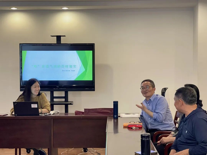 本次教师论坛,第一位出场的是万晓丽老师,她所带来的是“‘咯’系语气词的历史嬗变”课题。她表示了自己对于“咯”系语气词的研究是从新闻报道等频繁使用开始的,并对“咯”这个语气词进行历史溯源,同时结合南北方的语言得出了“咯”、“啰”等语气词之间的关系。