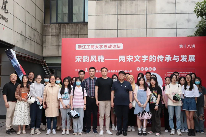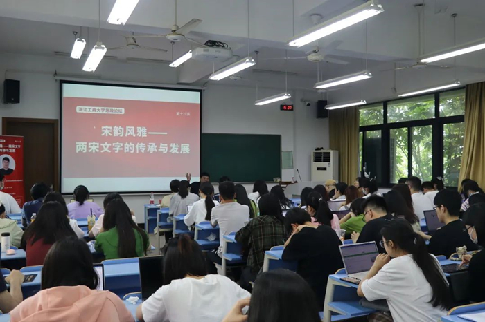 5月25日下午,“宋韵风雅——两宋文字的传承与发展”主题讲座在经济楼121教室举行。讲座由西泠印社社务委员会社团处副处长王臻应邀主讲。西泠印社何琦、吴晨蕾、张鑫、薛倩等老师,学校团委书记郑晓春、副书记张华,学生处副处长蒋旻、郝朝坤,学院党委副书记林琳,以及学院学生党员、发展对象等参加本场讲座。讲座由人文学院陈佳慧老师主持。