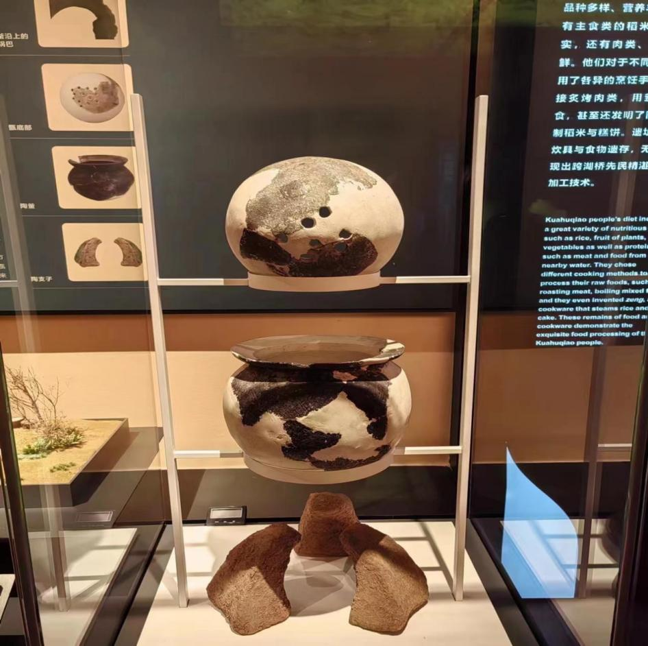 紧接着,大家来到二楼。相比于一楼的原址展厅,这里更加深入地展现跨湖桥先民的日常生活。此处陈列着琳琅满目的甑、甗等陶器,也有用来装饰的精美玉璜和打击用的石锛。玻璃柜中陈放的慢轮与水平踞织机,看似结构简单,实则是先民在物质技术条件极限缺乏情况下的伟大创造。