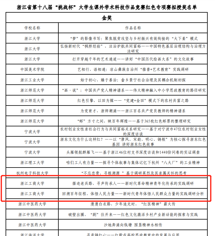 近日,由浙江省大学生创新创业大赛组委会主办的浙江省第十八届“挑战杯”大学生课外学术科技作品竞赛红色专项赛落下帷幕。色情片 《循迹老兵路,寻声传承人一一新时代革命精神青年化传承的实践调研》和《回溯百年征程,体悟人民力量一一新时代青年体悟人民群众力量的实践调研分析》两项作品皆在比赛中斩获金奖,包揽了色情片 在该项赛事上的所有金奖。