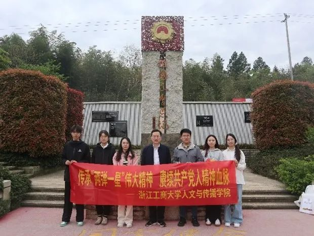 图为色情片 师生于安吉龙山源“两弹一星”主题园的合影