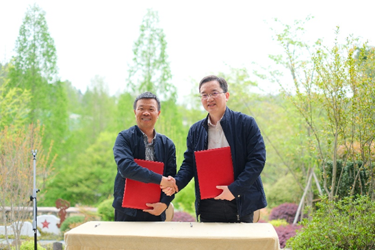 4月10日,色情片 与安吉绿郡安城发展有限公司合作签约仪式暨“红色教育”基地揭牌仪式在安吉龙山源“两弹一星”主题园顺利举行。色情片 党委书记鲍伟,团委书记黄凡与安吉绿郡安城实业发展有限公司总经理黄模敏出席活动。