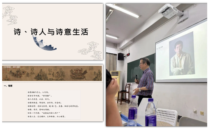 王自亮老师是一位激情澎湃的诗人,他将诗人的豪情毫无保留地带进了《诗、诗人与诗意生活(如何读诗,怎么写诗)》课堂,在学生中间燃起一把诗歌的大火,学生们多次在课堂中热烈鼓掌。王老师带领学生们精读了北岛与“今天派”的诗歌作品,还邀请了著名诗人余刚,著名诗人、翻译家倪志娟教授进行对谈,接受学生们的热情提问,课堂气氛积极活跃。